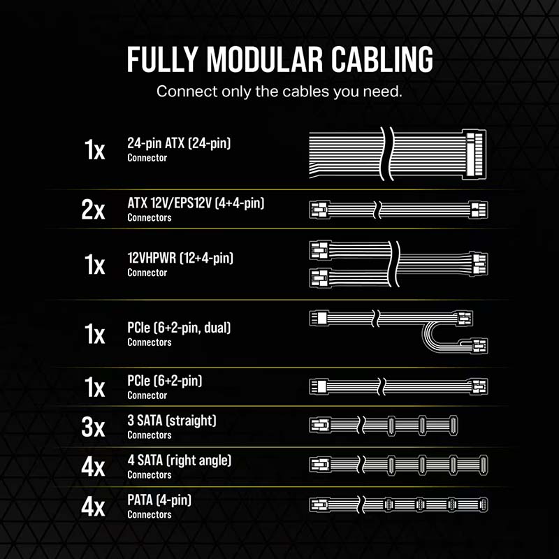 Modul fully Giảm sự lộn xộn của cáp bằng cách chỉ kết nối các cáp mà hệ thống của bạn cần. Năm đầu nối 8-pin dễ dàng đáp ứng mọi nhu cầu về nguồn của bo mạch chủ và GPU hiện đại |