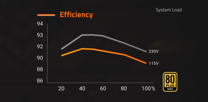 Chứng nhận chuẩn 80 Plus Gold Hiệu quả của nguồn cấp điện ảnh hưởng trực tiếp đến hiệu suất của hệ thống và mức tiêu thụ điện năng của bạn. Chứng nhận 80 PLUS Gold hứa hẹn mức tiêu thụ năng lượng thấp hơn và hiệu quả cao hơn.