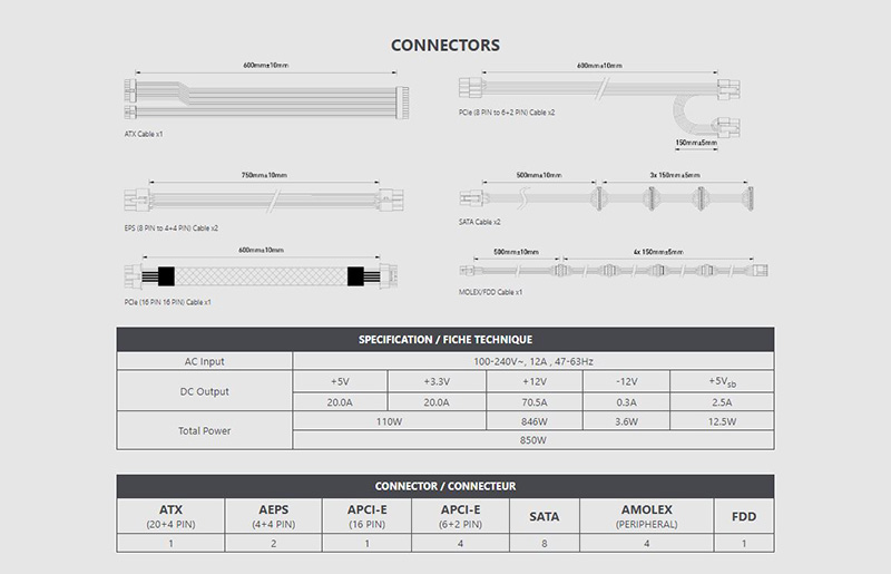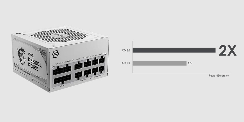 Nguồn máy tính MSI MAG A850GL PCIE5 WHITE được trang bị đầu nối 16 PIN để tương thích PCIe 5.0 và ATX 3.1. Nhờ có ATX 3.1, bộ nguồn cũng có thể nâng mức cung cấp tiêu thụ năng lượng lên gấp 2 lần và gấp 3 lần mức tiêu thụ năng lượng GPU.