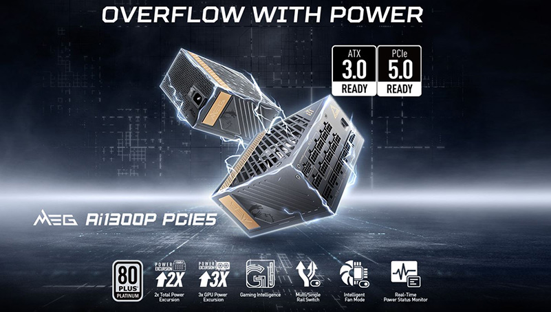 Sẵn sàng cho ATX 3.0 Nguồn máy tính MSI MEG Ai1300P PCIE5 được trang bị đầu nối 16 PIN để tương thích PCIe 5.0 và ATX 3.0. Nhờ có ATX 3.0, bộ nguồn cũng có thể nâng mức cung cấp tiêu thụ năng lượng lên gấp 2 lần và gấp 3 lần mức tiêu thụ năng lượng GPU. |