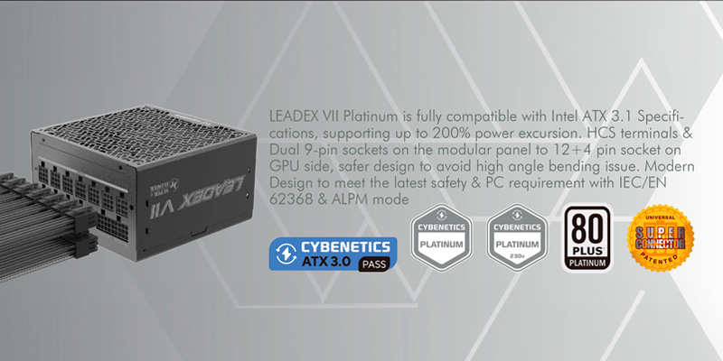 Nguồn tương thích chuẩn ATX 3.1 và EPS 12V v2.92, hỗ trợ 200% power excursion đảm bảo cấp điện ổn định cho VGA cao cấp. Trang bị cáp PCIe 12+4 Pin (12VHPWR), sẵn sàng cấp nguồn cho các dòng card đồ họa RTX 40 Series và GPU thế hệ tiếp theo. Công nghệ Super Connector 9-pin độc quyền giúp kết nối linh hoạt, an toàn, giảm thiểu hiện tượng gập cáp ở góc hẹp.