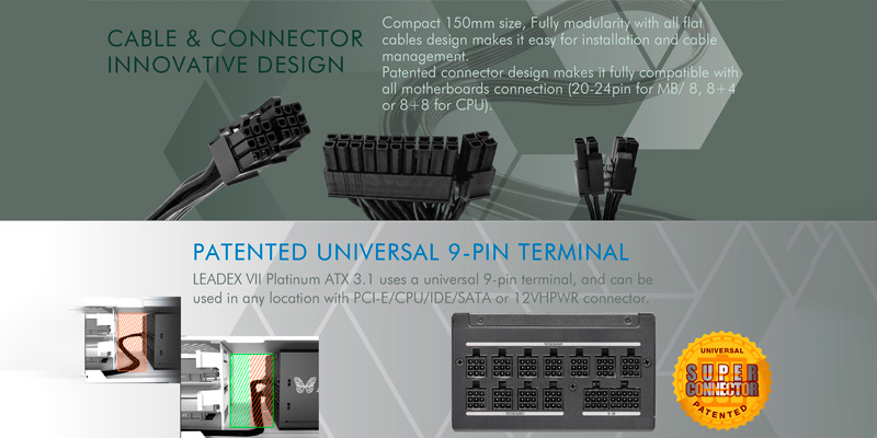 Leadex VII PRO 1200W sử dụng hệ thống cáp Full Modular, đi kèm dây ruy băng siêu mềm dẻo giúp dễ dàng lắp đặt, tối ưu airflow và làm gọn không gian case. Bộ cáp bao gồm: 1x 20+4 pin (600mm), 2x 8(4+4) pin CPU (700mm), 4x PCIe 6+2 pin (700mm), 3x SATA (550+130mm), 1x Molex (550+150mm), 1x PCIe 12+4 pin (700mm). Với số lượng cáp dồi dào, sản phẩm đáp ứng mọi nhu cầu build cấu hình từ phổ thông đến cao cấp.