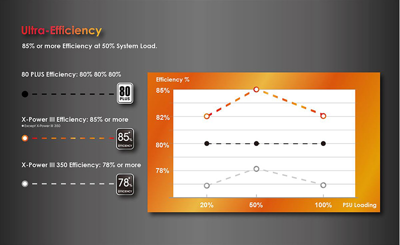 Chứng nhận 85% Efficiency Nguồn máy tính XIGMATEK X-POWER III X-550 hứa hẹn mức tiêu thụ năng lượng thấp hơn và hiệu quả cao hơn . |