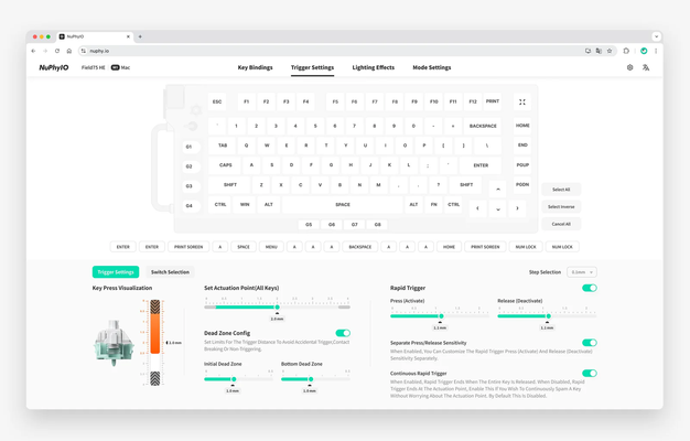 Tùy chỉnh điểm kích hoạt: Một trong những tính năng nổi bật nhất của Switch Nuphy Hall Effect là khả năng điều chỉnh điểm kích hoạt phím từ 0.1mm đến 4.0mm (Magnetic White) và 0.1mm đến 3.3mm (Magnetic Jade). Điều này cho phép người dùng tối ưu hóa thao tác, từ nhập liệu chính xác đến phản ứng nhanh trong các tựa game đối kháng.