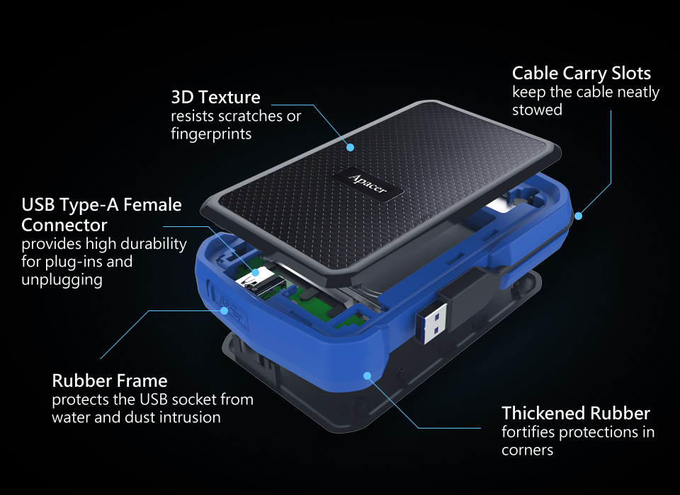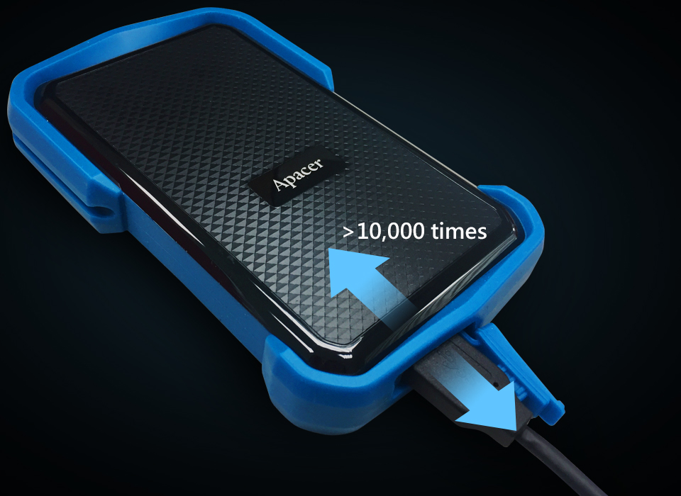 Durable USB Type-A Female Connector Ổ cứng di động chống Sock Apacer AC631 hỗ trợ chuẩn kết nối USB Type-A Female trên ổ với độ bền lên đến 10.000 lần cắm và rút liên tục, đảm bảo an toàn cho người sử dụng. |