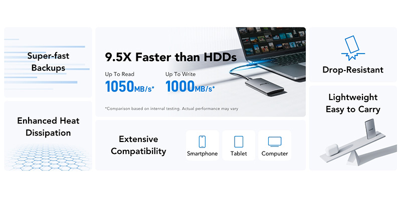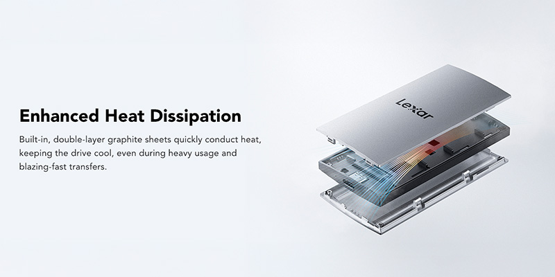 Khác biệt so với các dòng SSD thông thường, Lexar Portable ES3 được tích hợp hai lớp graphite tản nhiệt giúp hấp thụ và phân tán nhiệt nhanh, duy trì độ ổn định ngay cả khi xử lý các tác vụ nặng trong thời gian dài. Nhờ công nghệ tản nhiệt thụ động, ổ hoạt động êm ái, không phát ra tiếng ồn, phù hợp với không gian làm việc tĩnh lặng như văn phòng, phòng thu hoặc các buổi họp. Điều này không chỉ giúp kéo dài tuổi thọ của linh kiện bên trong mà còn đảm bảo dữ liệu được bảo vệ khỏi rủi ro hỏng hóc do quá nhiệt. Đặc biệt, ổ không cần quạt nên hoàn toàn không tiêu hao thêm năng lượng, phù hợp với các thiết bị di động như laptop và tablet.