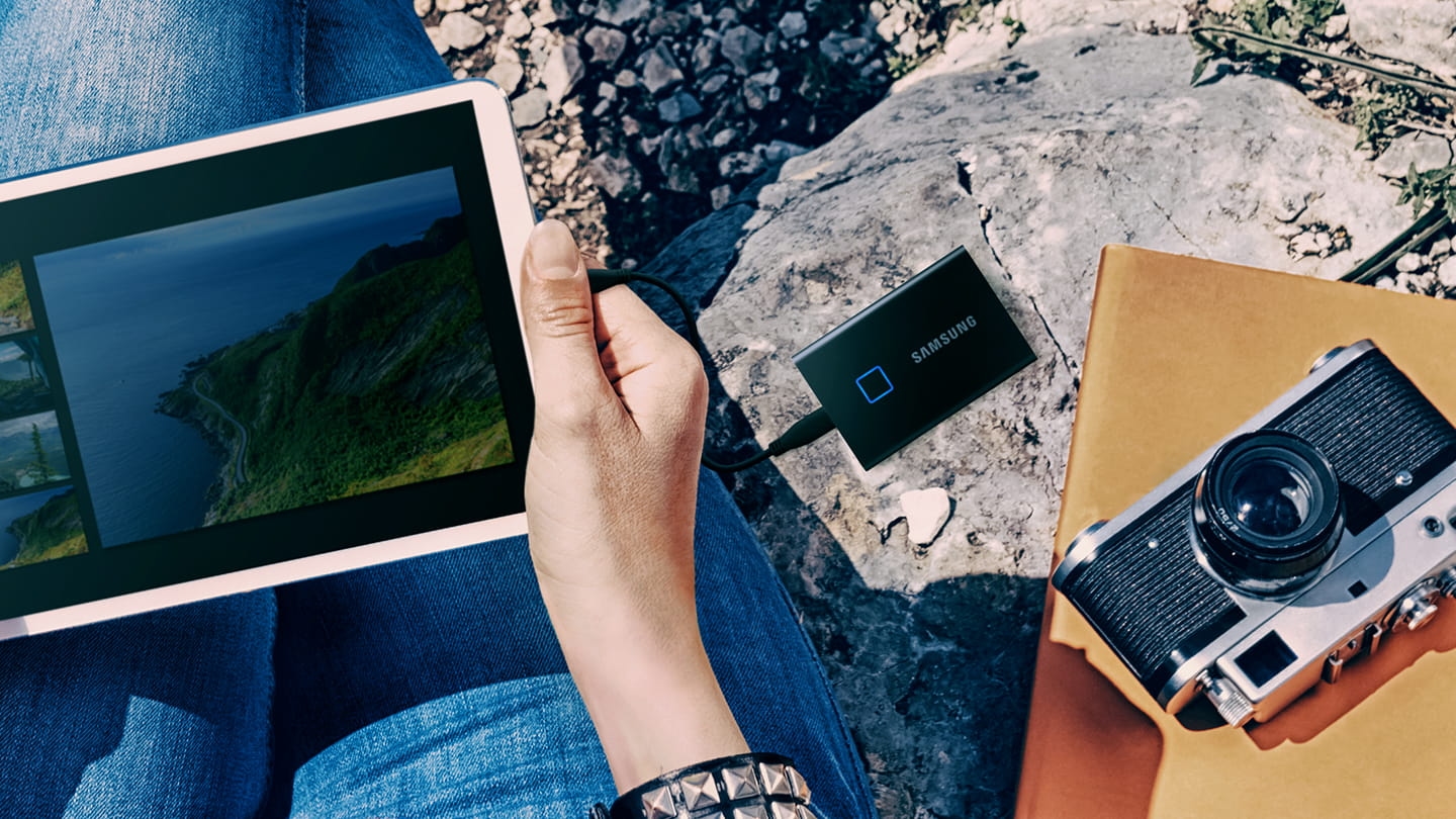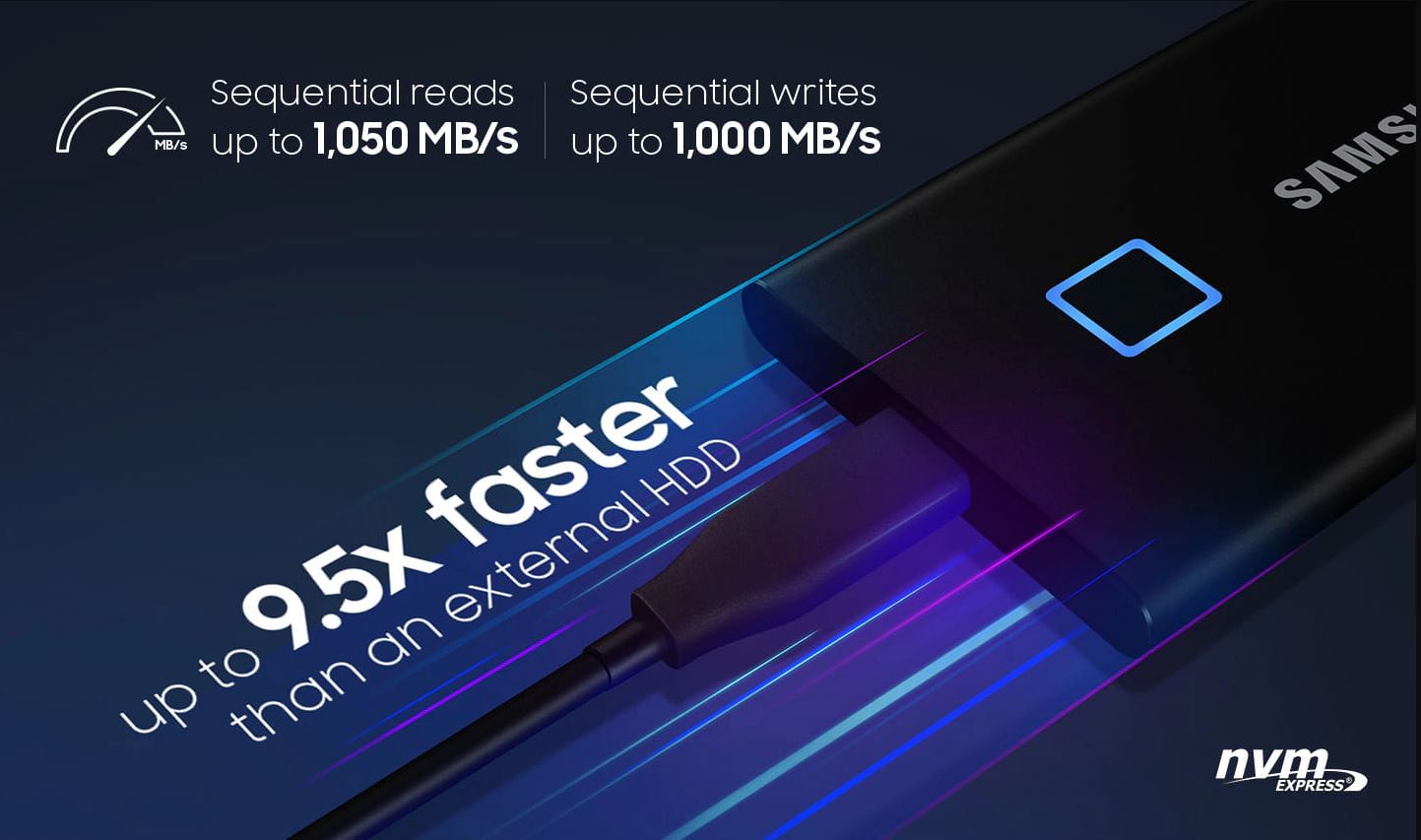 Tốc độ truyền tải cực nhanh Sao chép các tệp lớn chỉ trong vài giây với tốc độ đáng kinh ngạc của USB 3.2 Gen2 trên Ổ cứng di động SSD Samsung T7 Touch. Công nghệ NVMe PCIe tạo điều kiện cho tốc độ đọc / ghi tuần tự lên tới 1.050/1.000 MB/s, giúp cho SSD Samsung T7 Touch nhanh gần gấp đôi so với T5. |