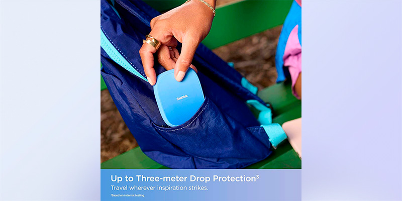 Được bao phủ bởi lớp vỏ silicone chống sốc cao cấp, SSD SanDisk Creator Phone có khả năng chống va đập từ độ cao đến 3 mét và đạt chuẩn kháng nước, kháng bụi IP65, sẵn sàng đồng hành cùng bạn trong mọi điều kiện khắc nghiệt – từ studio cho đến quay vlog ngoài trời, du lịch hoặc các cảnh quay hành động.