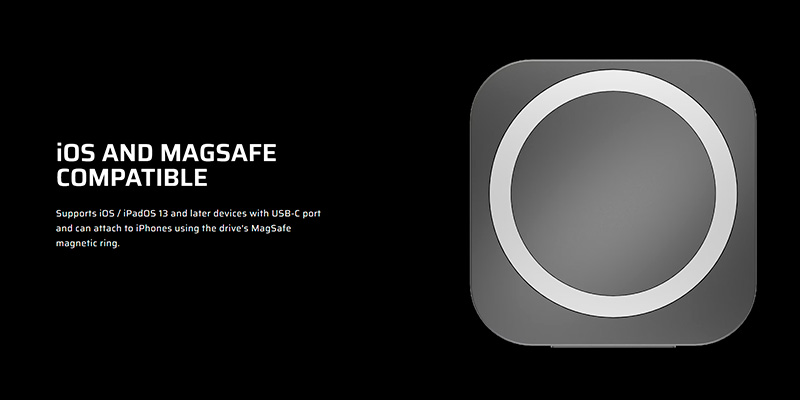 Corsair EX400U không chỉ tương thích với iPad mà còn hỗ trợ cả iPhone sử dụng cổng USB-C (từ iOS 13 trở lên), đặc biệt tích hợp nam châm MagSafe, giúp ổ SSD có thể hít chặt vào mặt lưng iPhone như một phụ kiện mở rộng – vô cùng tiện lợi khi bạn quay video dung lượng lớn hay cần lưu trữ ảnh nhanh chóng trên thiết bị di động Apple.