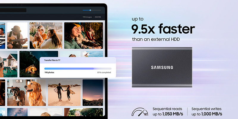 Ổ cứng di động SSD 4TB Samsung T7 1050MB/s MU-PC4T0T/WW mang lại hiệu suất ấn tượng nhờ tốc độ đọc lên tới 1050MB/s và tốc độ ghi đạt 1000MB/s, nhanh gấp gần 9 lần so với ổ cứng HDD thông thường. Với công nghệ USB 3.2 Gen 2 tiên tiến, thiết bị đảm bảo tốc độ truyền tải dữ liệu tối ưu, giúp bạn tiết kiệm thời gian khi làm việc với các tệp lớn như video 4K, đồ họa nặng hoặc game.