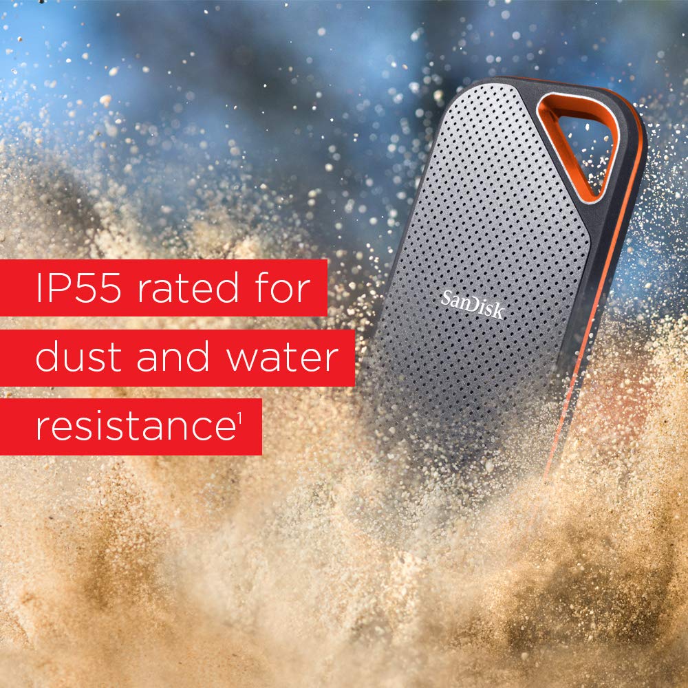 Độ bền cực cao Được thiết kế với một hệ thống đệm lót bằng cao su có độ đàn hồi tốt nhất, khả năng chống nước IP55 và đặc biệt không sử dụng hệ thống cơ quay, Ổ cứng di động SSD SanDisk Extreme Pro V2 E81 chống shock, chống rung cực tốt, có thể chịu được mưa và bụi giúp bảo về an toàn cho dữ liệu của bạn. |