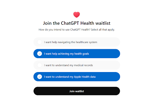 ChatGPT Health mở waitlist cho người dùng Free, Go, Plus, Pro ở các quốc gia được hỗ trợ, ngoại trừ khu vực EEA, Thụy Sĩ và Anh do quy định pháp lý. Ban đầu dành cho nhóm thử nghiệm nhỏ, OpenAI dự kiến mở rộng toàn cầu trong vài tuần tới. Người dùng Việt Nam có thể tham gia waitlist nếu thuộc gói đủ điều kiện (Nguồn: Open AI)