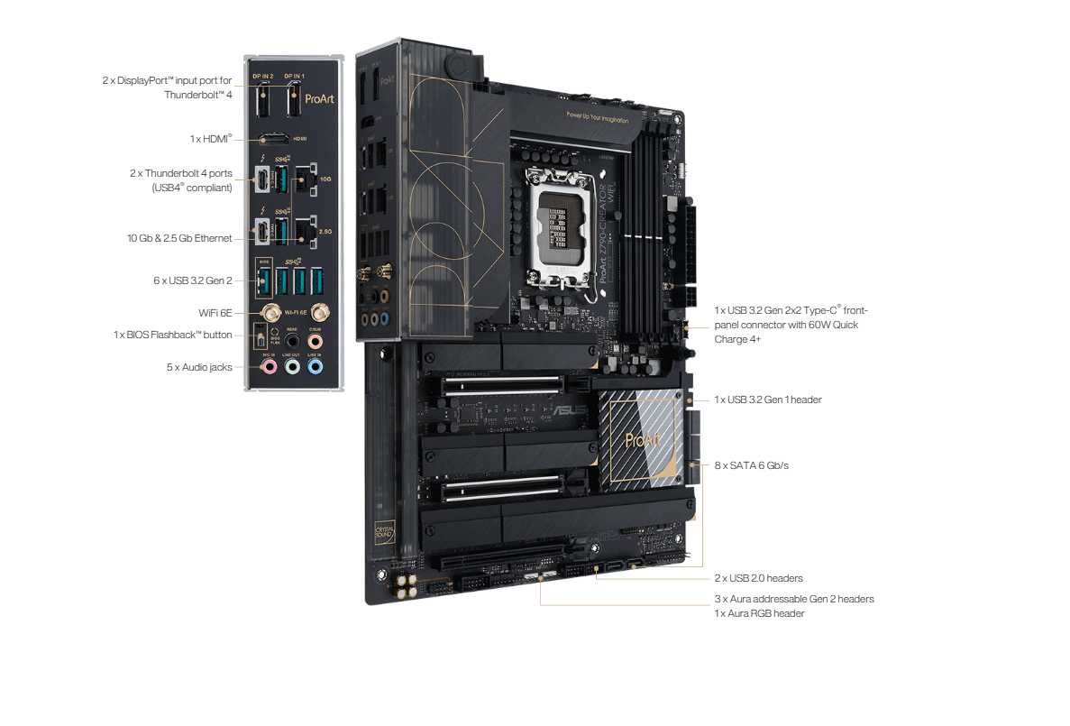 Cổng kết nối ProArt Z790-CREATOR WIFI được trang bị đẩy đủ các cổng kết nối để bạn dễ dàng lắp đặt. |