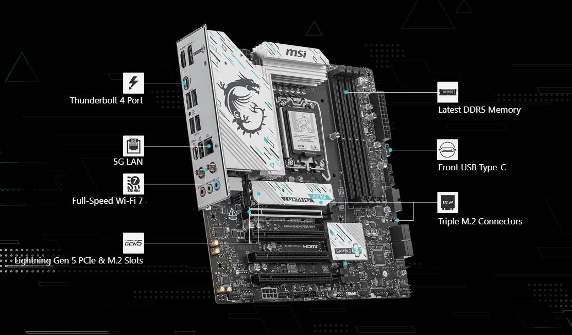 Cổng kết nối Mainboard PC MSI B860M GAMING PLUS WIFI Trang bị đầy đủ các cổng HDMI,DP và cổng USB 3.2 Gen 1 để bạn có thể dễ dàng kết nối hoặc truy xuất hình ảnh.
