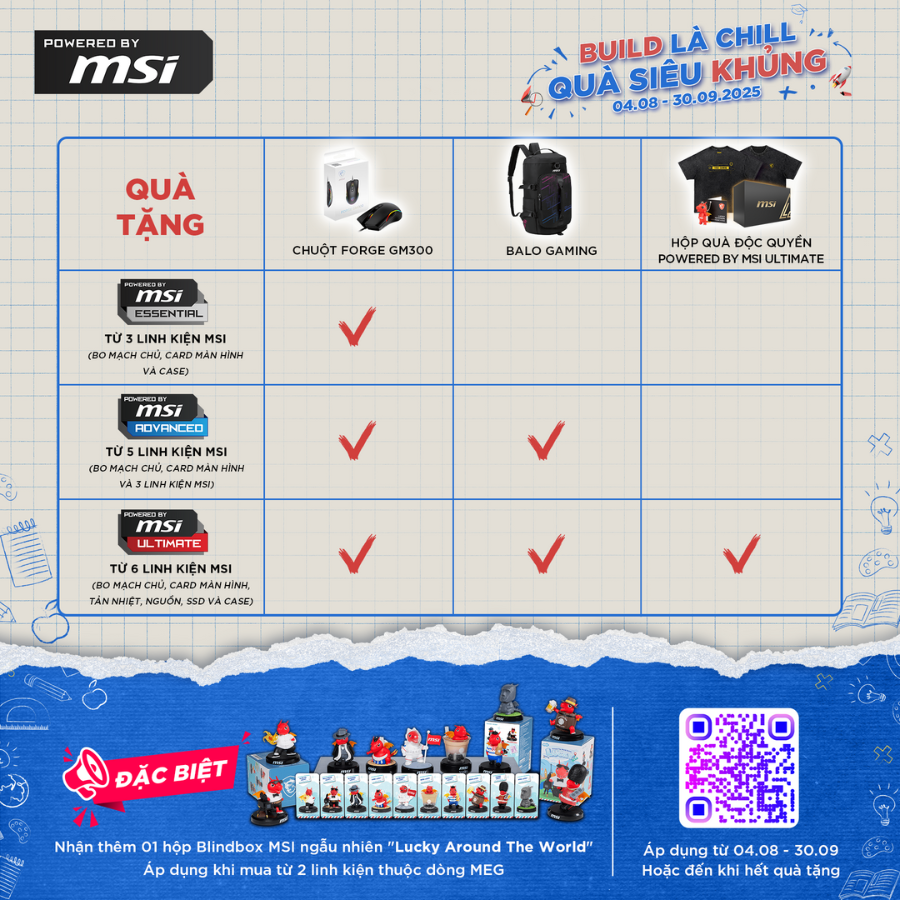 Từ 4/8-30/9/2025, khách hàng cá nhân khi mua sắm và xây dựng hệ thống PC sử dụng linh kiện từ thương hiệu MSI chính hãng.