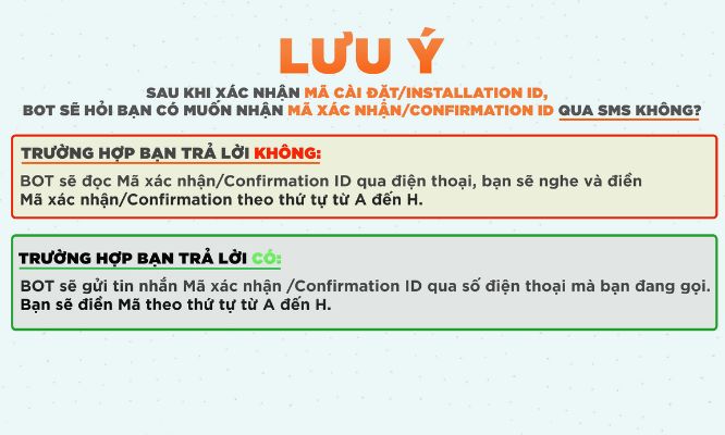 Nếu trả lời là không, BOT sẽ trực tiếp đọc mã xác nhận CID qua điện thoại, bạn sẽ nghe và điền vào các ô theo thứ tự từ A đến H. Và dưới đây là quy trình tiến hành thực hiện: