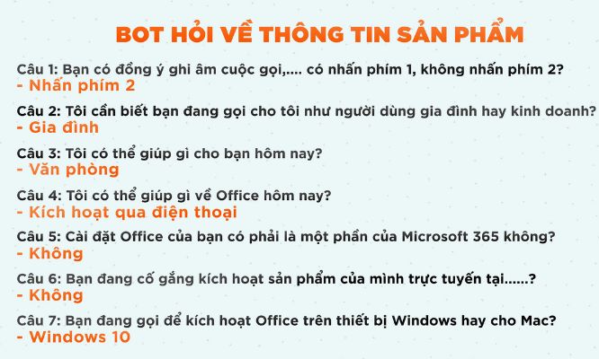 Ở đây thì các bạn sẽ trải qua 3 giai đoạn: BOT xác nhận thông tin Office, BOT xác nhận mã cài đặt IID và cuối cùng BOT trả mã kích hoạt CID.