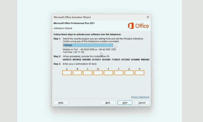 Lưu ý: Sau khi điền hết mã từ A đến H bạn nhớ chụp ảnh và lưu lại, vì là bản Office vĩnh viễn nên nếu cần cập nhật hệ điều hành mới, bạn chỉ cần nhập lại mã này là vẫn có thể tiếp tục sử dụng.