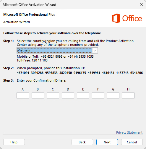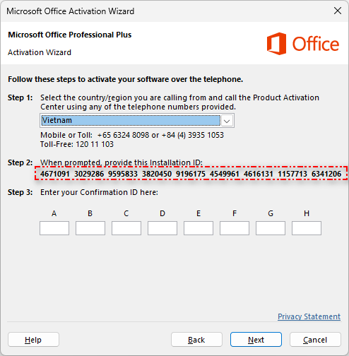 Lưu ý: Sau khi điền hết mã từ A đến H bạn nhớ chụp ảnh và lưu lại, vì là bản Office vĩnh viễn nên nếu cần cập nhật hệ điều hành mới, bạn chỉ cần nhập lại mã này là vẫn có thể tiếp tục sử dụng.
