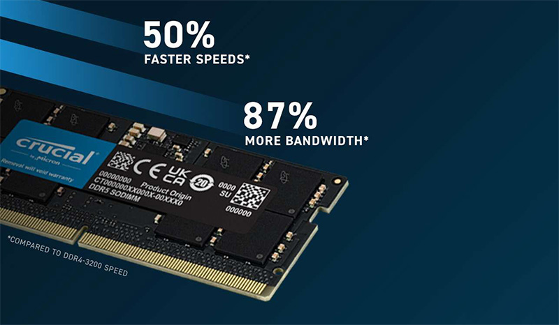 Tốc độ 5600MHz giúp Ram Crucial DDR5 64GB 5600MHz có khả năng xử lý dữ liệu nhanh hơn so với các loại RAM DDR4 thông thường. Nhờ vậy, bạn sẽ có trải nghiệm mượt mà hơn khi sử dụng laptop.