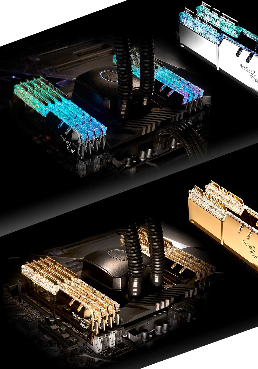 Ram PC G.SKILL Trident Z Royal Series DDR4 RGB Ram PC G.Skill Trident Z Royal là thành viên mới nhất trong dòng sản phẩm Trident Z của G.Skill. Với thiết kế phong cách hoàng gia cực kỳ quý phái và được chế tác tỉ mỉ, thanh ánh sáng kết tinh tán xạ màu RGB sẽ cho hiệu ứng tuyệt đẹp. Bộ tản nhiệt bằng nhôm được đánh bóng bằng màu vàng hoặc bạc giúp làm mát các mô-đun bộ nhớ bên trong. Được thiết kế với 8 vùng RGB có thể điều khiển và được kiểm tra độ tin cậy, khả năng tương thích và hiệu suất trên nhiều loại bo mạch chủ, cung cấp tốc độ đáng kinh ngạc lên đến DDR4-4600 MHz và hơn thế nữa, Trident Z Royal là bộ nhớ RGB hiệu năng cao cuối cùng. |