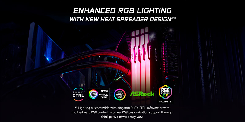 RAM được trang bị hệ thống đèn LED RGB nhiều vùng màu, có thể tùy chỉnh thông qua phần mềm Kingston FURY CTRL. Ngoài ra, sản phẩm còn hỗ trợ đồng bộ ánh sáng với các phần mềm như ASUS Aura Sync, Gigabyte RGB Fusion, MSI Mystic Light và ASRock Polychrome, giúp bạn dễ dàng cá nhân hóa hệ thống theo phong cách riêng.