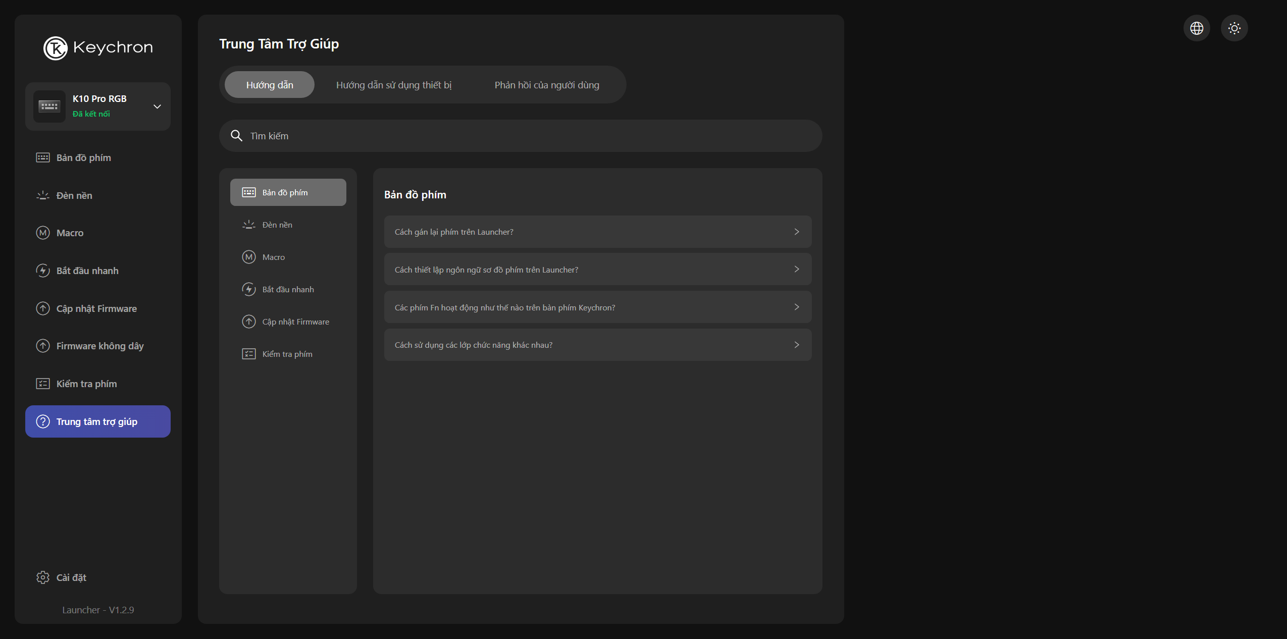 Bạn có thể sử dụng Keychron Launcher ngay trên trình duyệt tại đây: https://launcher.keychron.com. Hiện ứng dụng đã hỗ trợ tiếng Việt và tương thích với tất cả các dòng bàn phím Keychron.
