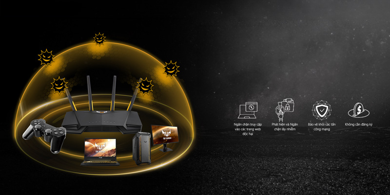 TUF Gaming AX3000 hỗ trợ WPA3 để kết hợp các phương thức bảo mật mới nhất nhằm giữ an toàn cho tất cả người dùng trên mạng. Ngoài ra, AiProtection Pro do Trend Micro cung cấp sẽ giúp bảo vệ các thiết bị của bạn khỏi các cuộc tấn công và đe dọa bên ngoài, bao gồm các thiết bị không thể cài đặt phần mềm chống virus - như máy chơi game console, điện thoại thông minh và thiết bị IoT. Bảo mật này cũng thường xuyên được cập nhật tự động để đảm bảo mạng của bạn được bảo vệ liên tục.