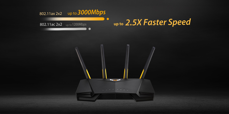 Router WiFi 6 Asus TUF Gaming AX3000 AiMesh hỗ trợ chuẩn WiFi 6 (802.11ax) mới nhất, sở hữu băng thông 160 MHz với công nghệ OFDMA và MU-MIMO mới nhất để cung cấp dung lượng và hiệu quả WiFi tuyệt vời1. Đồng thời, WiFi 6 cũng cho phép tăng đáng kể tốc độ mạng lên tới 574 Mbps (băng tần 2,4 GHz) và 2404 Mbps (băng tần 5 GHz) - nhanh hơn tới 2,5 lần so với các router băng tần kép 802.11ac.