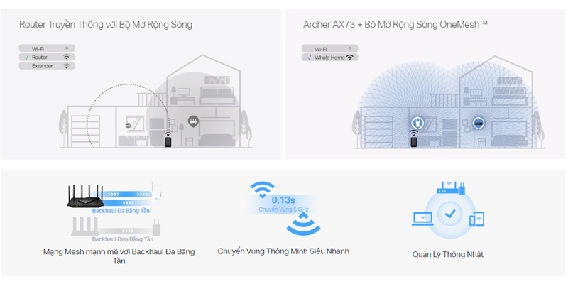 Router WiFi 6 TP-Link Archer AX73 hỗ trợ OneMesh để tạo thành vùng phủ sóng liền mạch cho toàn bộ ngôi nhà, không còn rớt mạng và trễ khi bạn di chuyển trong nhà..