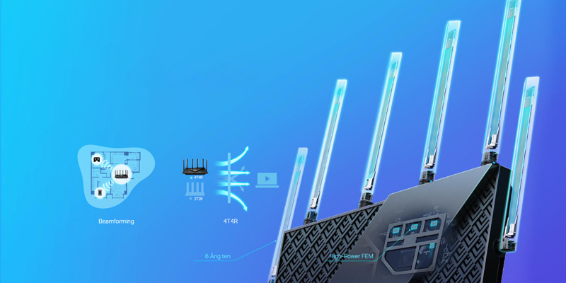 Tận hưởng kết nối Wi-Fi ổn định ngay cả trong nhà bếp và phòng ngủ. Các cấu trúc FEM, 6 ăng ten, Beamforming và 4T4R công suất cao kết hợp với nhau điều chỉnh vùng phủ sóng Wi-Fi hoàn toàn phù hợp với ngôi nhà của bạn và tập trung cường độ tín hiệu cho các thiết bị của bạn.