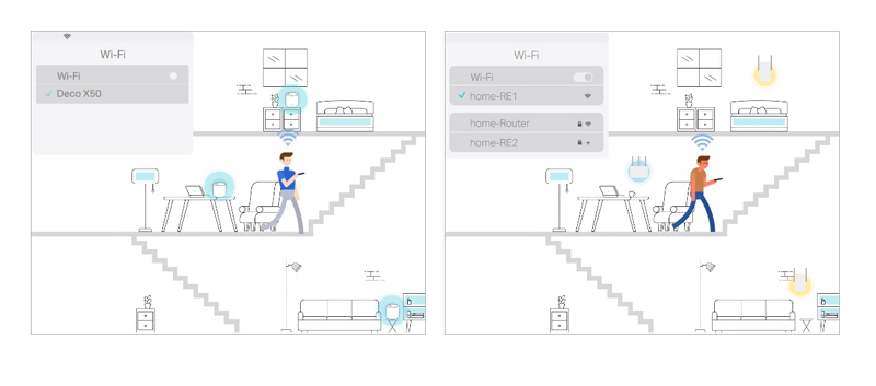TP-Link Mesh có nghĩa là các thiết bị Deco hoạt động cùng nhau để tạo thành một mạng thống nhất. Điện thoại hoặc máy tính bảng của bạn tự động kết nối với Deco nhanh nhất khi bạn di chuyển trong nhà, tạo ra trải nghiệm WiFi thực sự liền mạch.