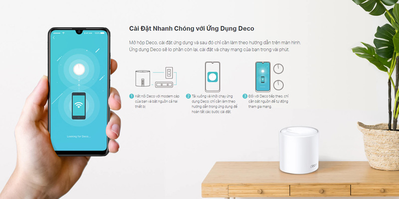 Mở hộp Deco, cài đặt ứng dụng và sau đó chỉ cần làm theo hướng dẫn trên màn hình. Ứng dụng Deco sẽ lo phần còn lại, cài đặt và chạy mạng của bạn trong vài phút.