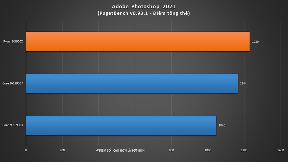 Ứng dụng Photoshop ưu tiên hiệu suất IPC đơn nhân và thường không tận dụng được lợi thế nhiều nhân CPU hơn. Mặc dù Intel cho biết đã cải thiện IPC đến 19% so với thế hệ trước nhưng vẫn chưa đủ để đánh bại Ryzen là ông hoàng hiệu suất Photoshop.