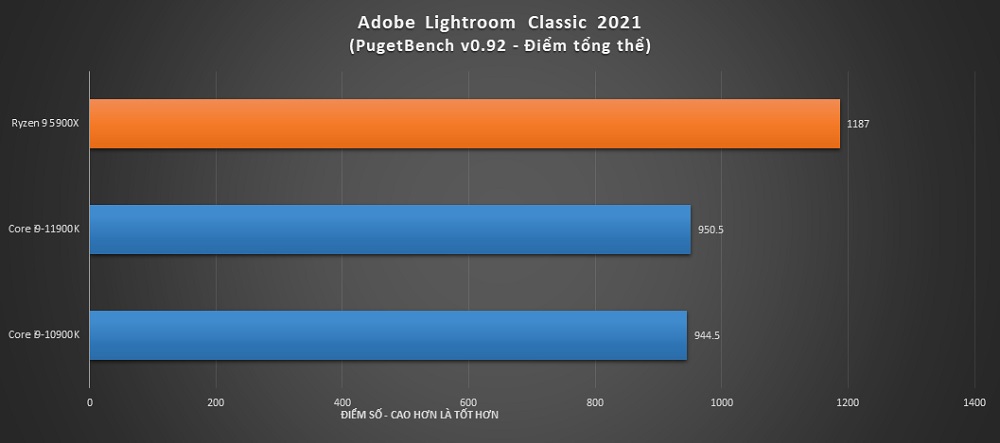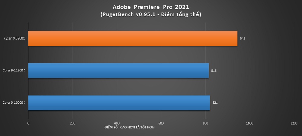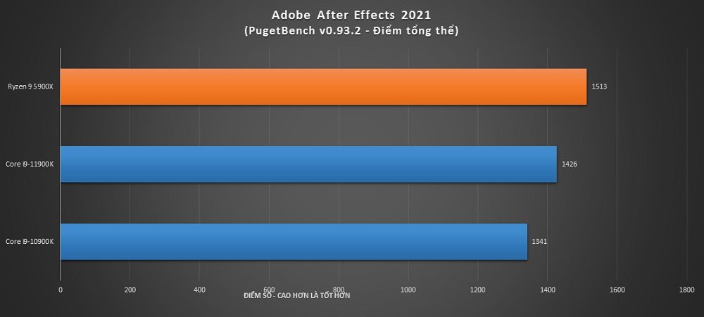 Tương tự DaVinci Resolve, Premiere Pro cũng tận dụng được lợi thế nhiều nhân của 5900X. Không bất ngờ khi 11900K kém hơn 5900X tới 16%, thậm chí còn thua 10900K đời trước 1%.