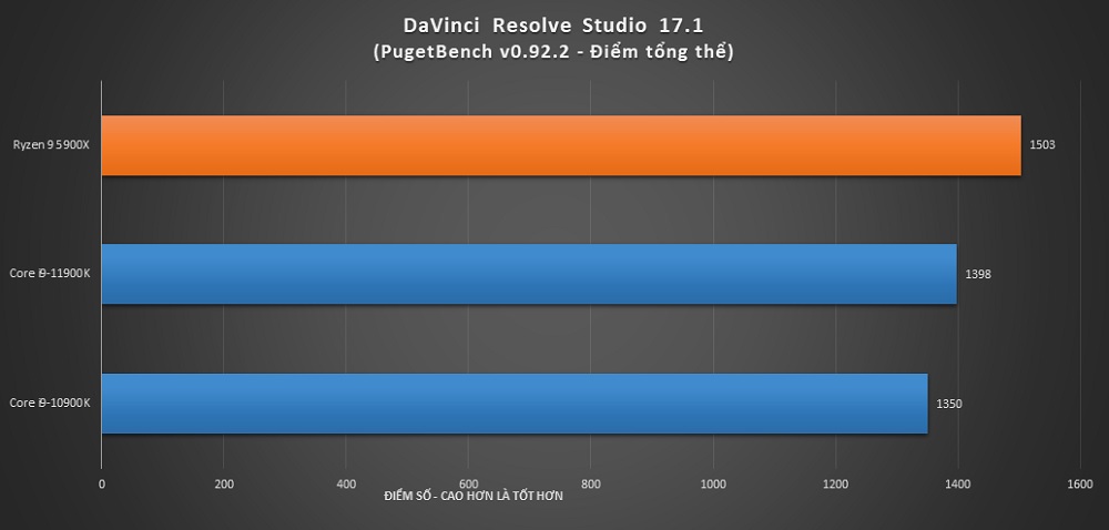 DaVinci Resolve tận dụng rất tốt lợi thế nhiều nhân của CPU, đây cũng là điểm thiệt thòi của 11900K khi bị cắt giảm số lượng nhân (từ 10 xuống 8) so với 10900K, dù được cải thiện IPC.