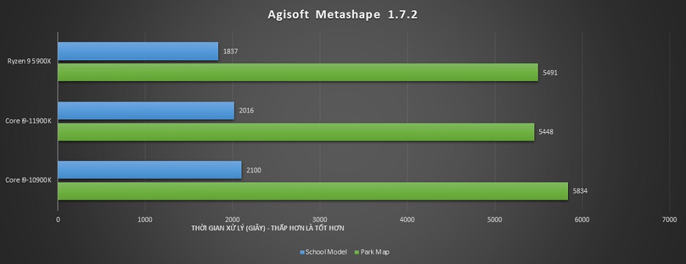 Core i9-11900K hoạt động khá tốt trong Metashape nhưng vẫn chưa thể đánh bại Ryzen 9 5900X. Cụ thể trong tác vụ xử lý model 3D - School Model (439 ảnh, 18MP mỗi ảnh), 5900X xử lý nhanh hơn khoảng 10%.