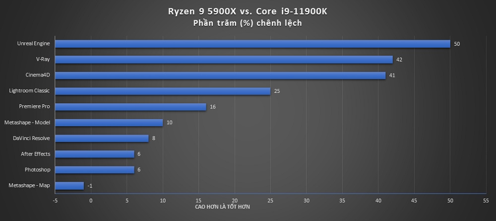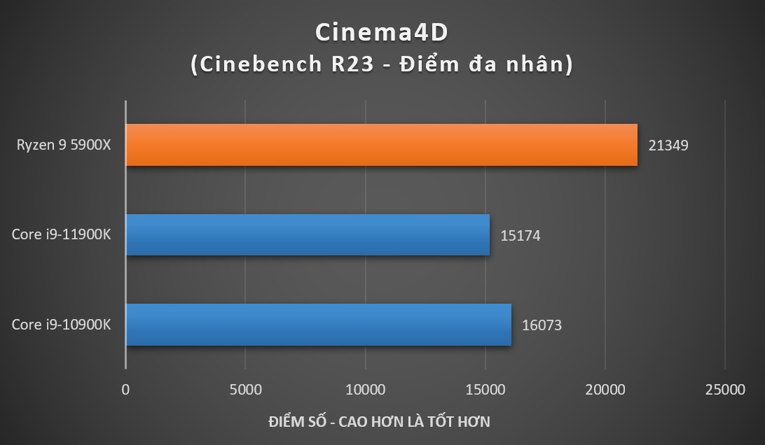 Ryzen 9 5900X nhanh hơn Core i9-11900K khoảng 6%, trong khi nhanh hơn Core i9-10900K khoảng 18%.
