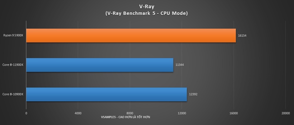 Tương tự vậy, render trong V-Ray cũng cho kết quả vượt trội hoàn toàn của Ryzen 9 5900X, nhanh hơn tới 42% so với Core i9-11900K. Core i9-10900K với 2 nhân nhiều hơn cũng nhanh hơn 11900K khoảng 9%.