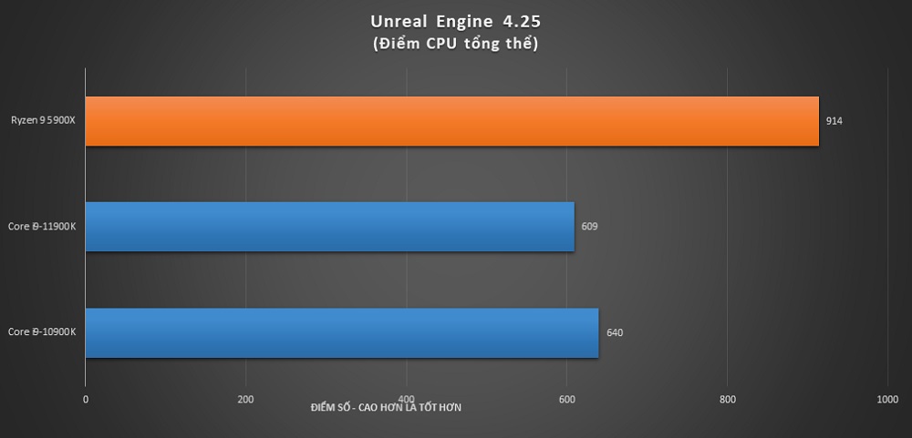 Unreal Engine là ứng dụng có thể tận dụng tối đa tất cả các nhân của CPU. Intel Gen 11 chỉ cung cấp tối đa 8 nhân, vì vậy rõ ràng CPU 12 nhân như 5900X dễ dàng vượt trội hơn bất cứ thứ gì Intel đang có.