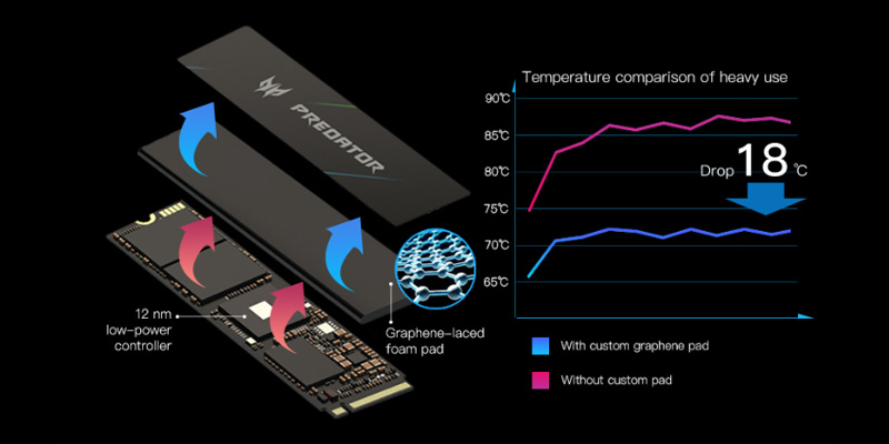 SSD Acer Predator GM7000 sử dụng bộ điều khiển 12 nm với bố cục PCB nhỏ gọn đặc biệt để đạt được mức tiêu thụ điện năng và nhiệt độ thấp hơn. Ngoài ra, GM7000 còn có một miếng xốp bọc graphene tùy chỉnh có tính dẫn nhiệt cao hơn, tản nhiệt và giảm nhiệt độ vận hành đáng kể (khoảng 18°C)-- ngay cả khi tải khối lượng công việc nặng. Quản lý nhiệt tốt hơn giúp SSD GM7000 đáng tin cậy hơn và cùng với đó là độ ổn định dẫn đến tốc độ tốt hơn.