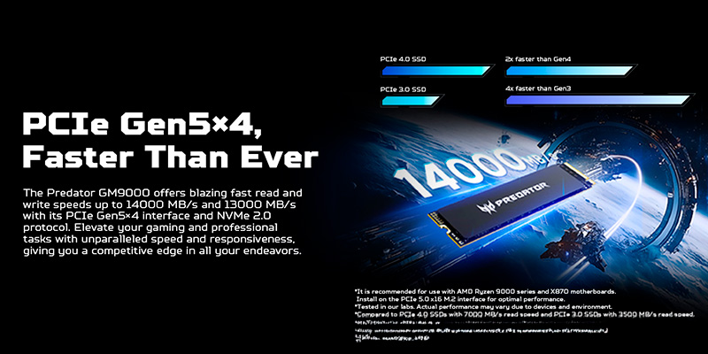 SSD Acer Predator GM9000 2TB PCIe Gen5 x4 NVMe M.2 GM9000-2TB là chiếc ổ cứng đỉnh cao được thiết kế dành cho những người dùng muốn tận dụng triệt để hiệu năng từ nền tảng PCIe 5.0 x4 và chuẩn giao tiếp NVMe 2.0 mới nhất. Với tốc độ đọc lên đến 14.000MB/s và ghi 13.000MB/s, đây là một trong những SSD nhanh nhất thế giới hiện tại, vượt xa mọi tiêu chuẩn tốc độ của PCIe Gen4. Ổ còn hỗ trợ IOPS ngẫu nhiên lên tới 1.600.000, đảm bảo phản hồi tức thì trong cả những tác vụ nặng như dựng video 8K, chơi game AAA, mô phỏng 3D hoặc khởi chạy hàng trăm tác vụ đồng thời. Đây chính là giải pháp lưu trữ thế hệ mới lý tưởng cho các hệ thống máy tính cao cấp đang sử dụng nền tảng Intel 14th Gen hoặc AMD Ryzen 8000 series.