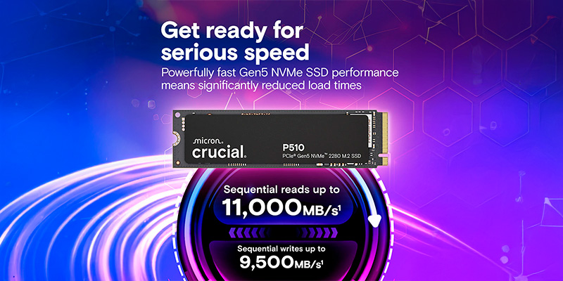 SSD Crucial P510 1TB M.2 PCIe Gen5 x4 NVMe CT1000P510SSD8 mang đến định nghĩa mới về tốc độ "nghiêm túc" (Serious speed) cho hệ thống máy tính của bạn. Được trang bị giao diện NVMe PCIe Gen5 x4 mới nhất, ổ cứng này đạt tốc độ đọc tuần tự lên đến 11.000 MB/s và tốc độ ghi tuần tự 9.500 MB/s. Sức mạnh này giúp giảm thiểu đáng kể thời gian chờ đợi khi tải các tựa game nặng, khởi động ứng dụng đồ họa phức tạp, mang lại trải nghiệm mượt mà và phản hồi tức thì mà các chuẩn SSD đời cũ không thể so sánh được.