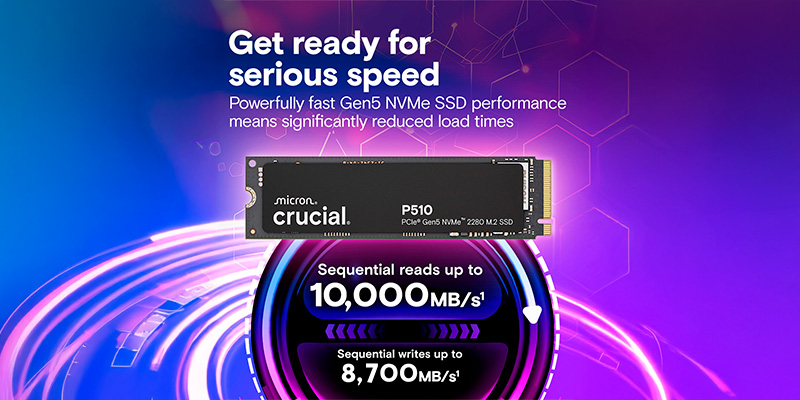 SSD Crucial P510 1TB đạt tốc độ đọc tuần tự lên tới 10.000 MB/s và tốc độ ghi tuần tự 8.700 MB/s, tận dụng tối đa băng thông của chuẩn PCIe Gen5.