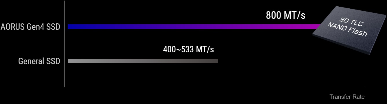 | Nand Flash chất lượng cao nhất Ổ cứng SSD Gigabyte Aorus PCIe Gen4 x4 NVMe M.2 được trang bị NAND Flash chất lượng cao và được chọn lọc cực kỳ chặt chẽ với công nghệ 96-layers để mang đến không gian lưu trữ nhiều hơn trên một đơn vị diện tích. Băng thông 800MT/s trên SSD AORUS Gen 4 vượt xa các thiết bị PCIe 3.0x4 để có hiệu suất lưu trữ vượt trội.