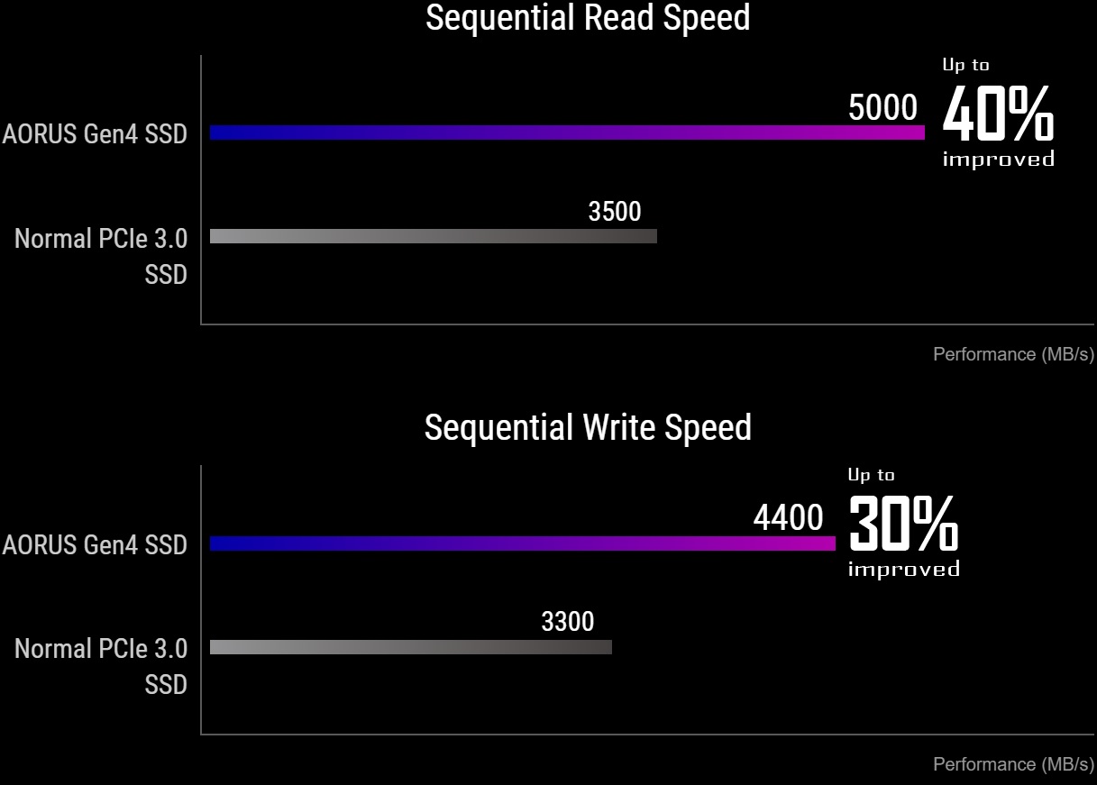 | Nand Flash chất lượng cao nhất Với bộ điều khiển PCIe 4.0 mới, ổ cứng SSD Gigabyte Aorus PCIe Gen4 x4 NVMe M.2 mang lại tốc độ cực nhanh lên đến 5.000 MB/s đọc và lên đến 4.400 MB/s ghi, nhanh hơn tới 40% so với SSD PCIe 3.0.