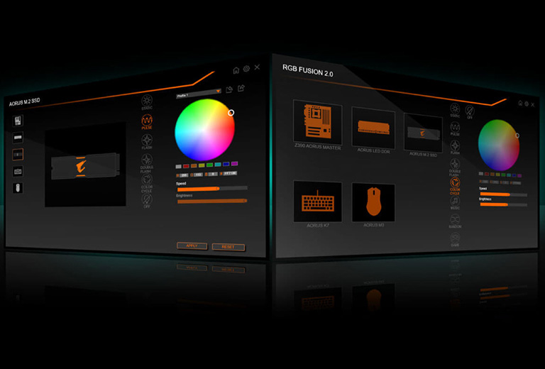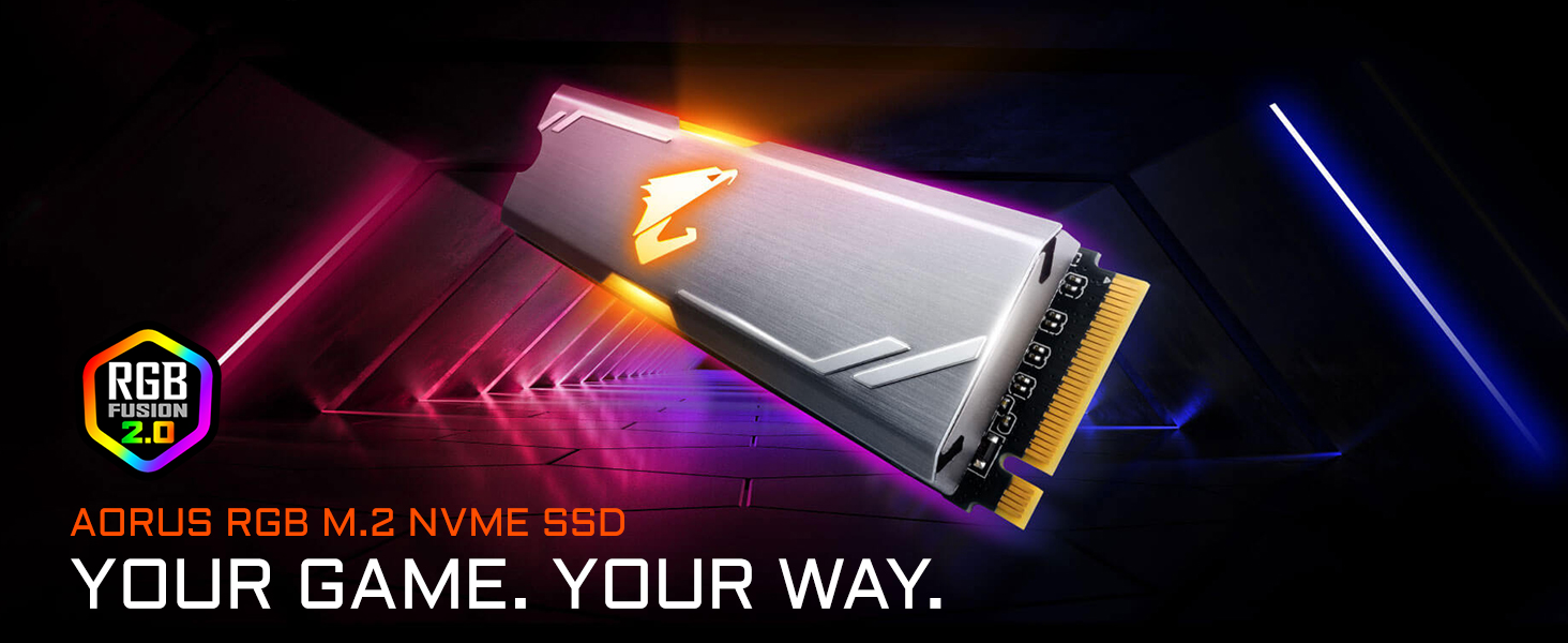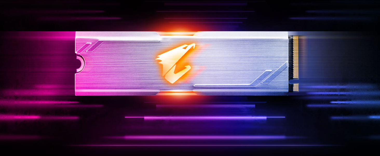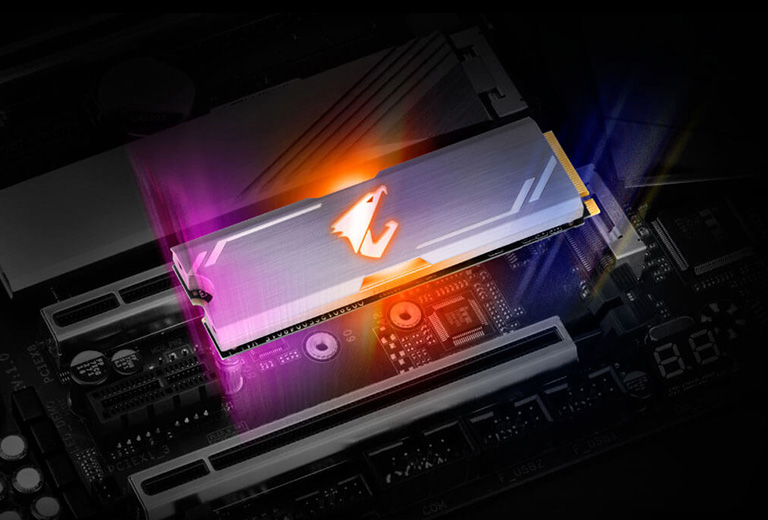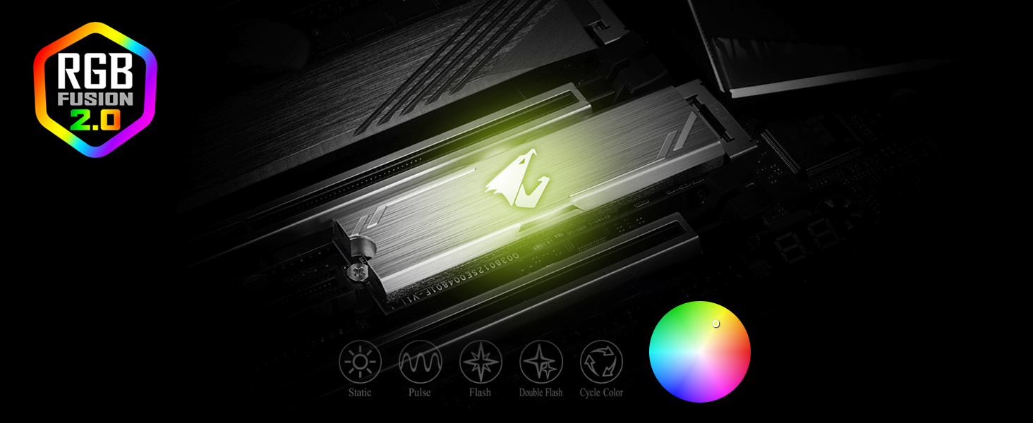 RGB Fusion Ổ cứng Gigabyte Aorus RGB PCIe Gen3 x4 NVMe M.2 là dòng SSD đầu tiên có thể đồng bộ hóa hoàn hảo với bo mạch chủ, hỗ trợ 5 hiệu ứng ánh sáng bao gồm tĩnh, flash, flash kép và chu kỳ màu.
