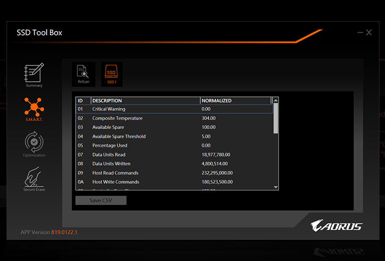 SSD Tool Box SSD Tool Box là ứng dụng giúp người dùng theo dõi SSD Status, cung cấp thông tin chung như tên model, phiên bản FW, tình trạng sức khỏe, tối ưu hóa ổ đĩa và cũng phát hiện nhiệt độ thông qua các cảm biến. Hơn nữa, người dùng có thể xóa tất cả dữ liệu với chức năng Secure Erase. Bạn có thể tải xuống từ trang chủ của Gigabyte. |