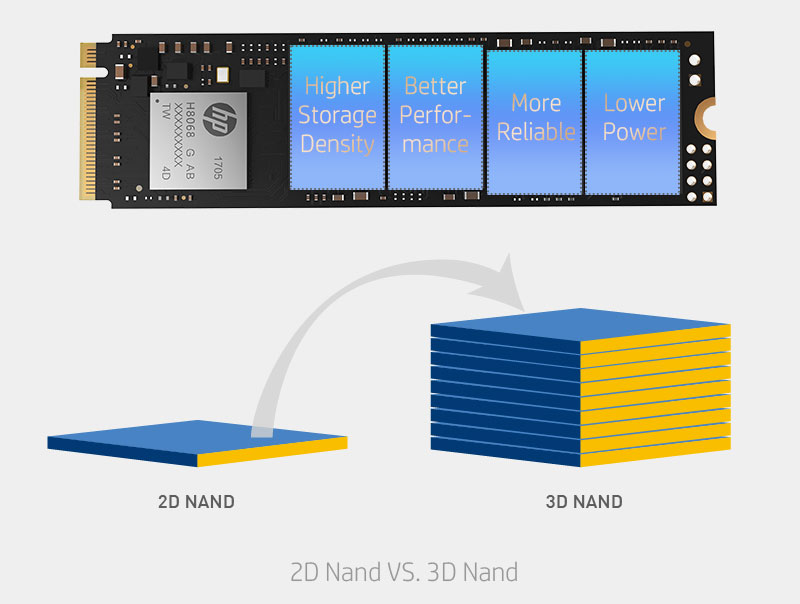 3D NAND Flash - Phá vỡ giới hạn không gian lưu trữ Ổ cứng SSD HP EX900 PCIe Gen3 x4 NVMe được trang bị công nghệ 3D-NAND Flash mang đến dung lượng lưu trữ cao, đáng tin cậy và bền hơn so với Flash NAND 2D truyền thống. Và đặc biệt nhất đó là giá thành cực kỳ tốt. |