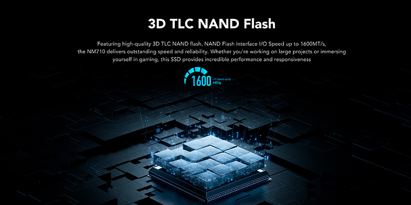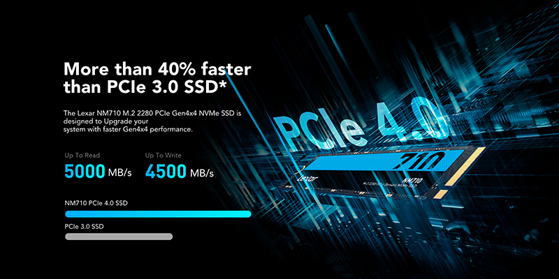 Lexar NM710 500GB tận dụng giao thức PCIe Gen4 x4, mang lại tốc độ truyền tải dữ liệu gấp đôi so với thế hệ PCIe Gen3, giúp cải thiện đáng kể hiệu năng của hệ thống. Với tốc độ đọc lên đến 5000MB/s và tốc độ ghi 2600MB/s, chiếc SSD này giúp tăng tốc độ khởi động hệ điều hành, load game và xử lý dữ liệu nhanh chóng, mang đến trải nghiệm mượt mà, không độ trễ.